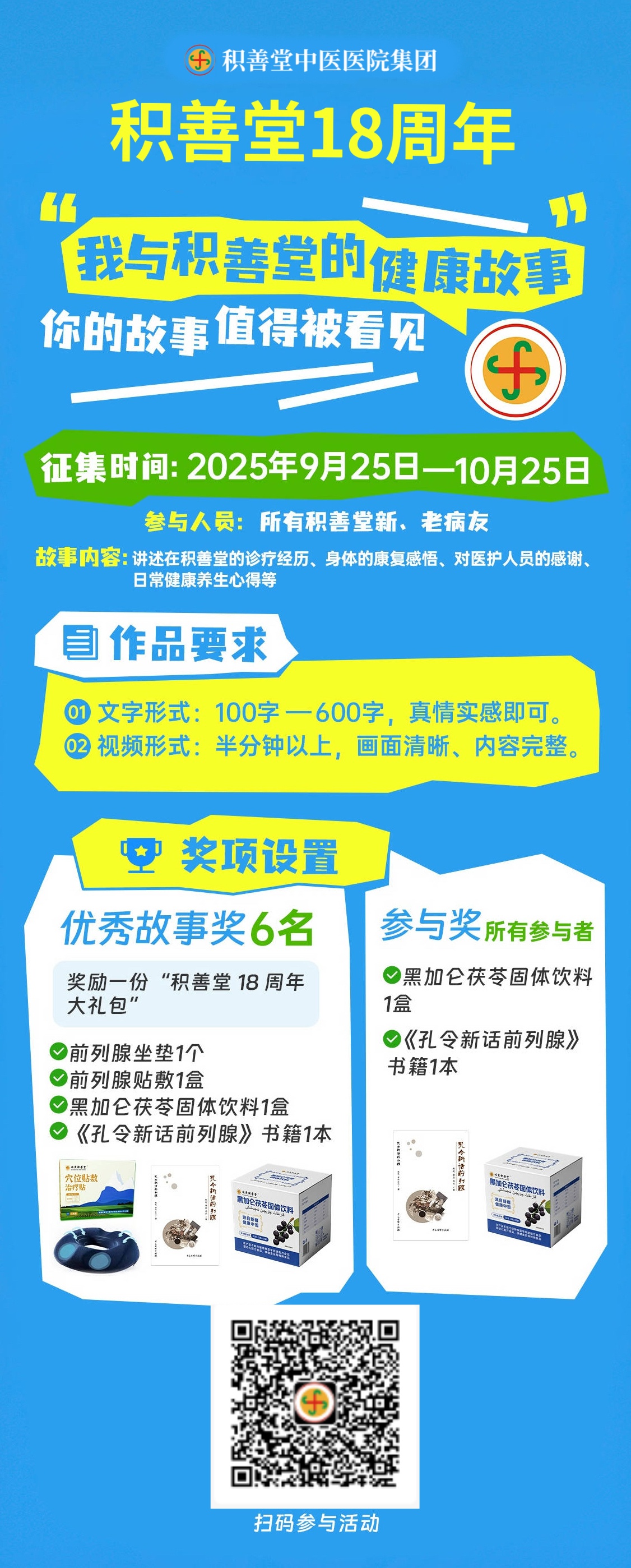 如今,积善堂 18 周年系列活动温情启幕,“我与积善堂的健康故事” 有奖征集正式开启!我们想倾听你的经历,让更多人看见健康的可能,也让这份温暖与信任传递下去。